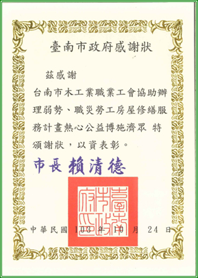 103年本會協助弱勢職災勞工房屋修繕服務計畫獲頒感謝狀