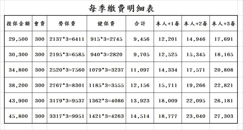 *勞 保 費:每月2,137元*3個月=$6,411【隨勞保局之調整而變動】