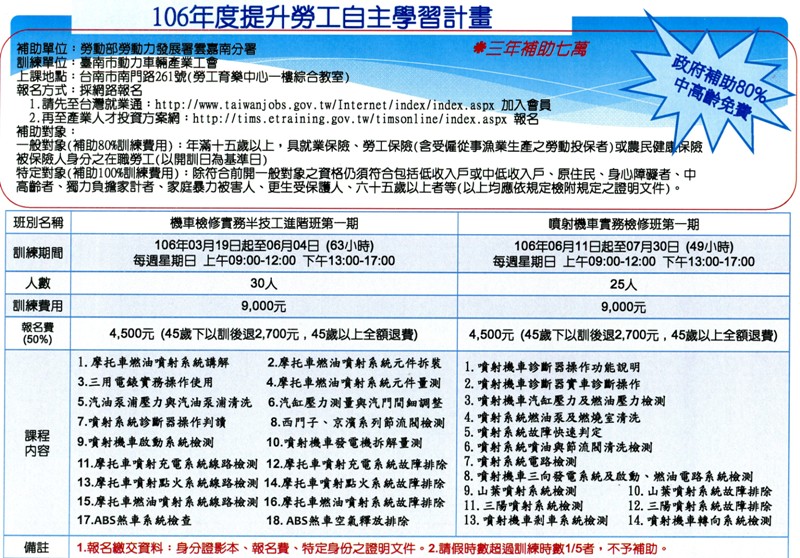 ..本班將連結106下半年度高階班課程..並於下半年高階班課程結束後輔導報考機車修護乙級技術