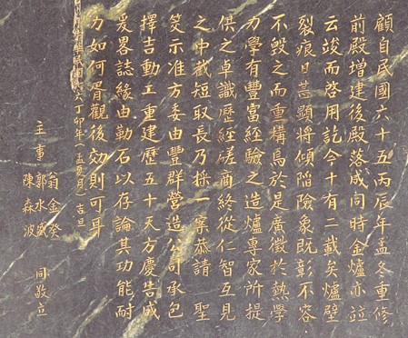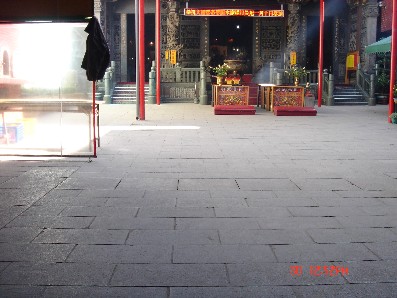 ---------------民國八十九年(西元二OOO年)中庭舖石------------ 民國八十九年初.整修中庭及排水工程.中庭除增設排水系統外.將中庭舖蓋泉州白石.材美工良.合乎古制.同時將大殿前入口階梯.原白鐵之欄杆扶手.更換為石製欄杆扶手.使大殿更為莊嚴.