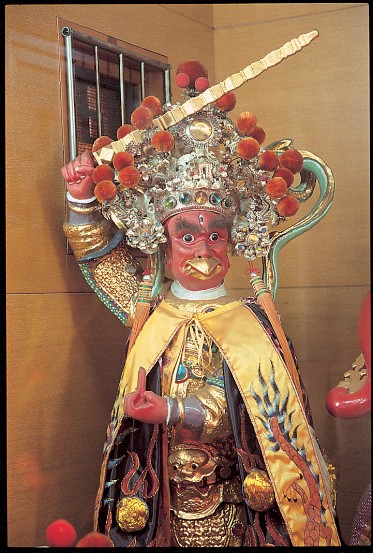 王靈天君全稱為「大靈官太乙雷聲王天君」為中國湘陰之神廟,無姓氏,西河薩真人見其廟血食太重,以飛符焚燒其廟,王靈天君被燒成火眼金睛,一怒之下,向天庭奏報。玉皇賜予慧眼金鞭,暗中跟隨薩真人,見有出差錯時,可一報前仇。經數年,真人未有過失,內心敬佩,拜真人為師,隨侍左右。真人乃辟八卦以王為其姓,善為其名,並錄為雷部二十四神中能興雲助雨之神,教訓做壞事之人,因而成為道家護法監壇之神。