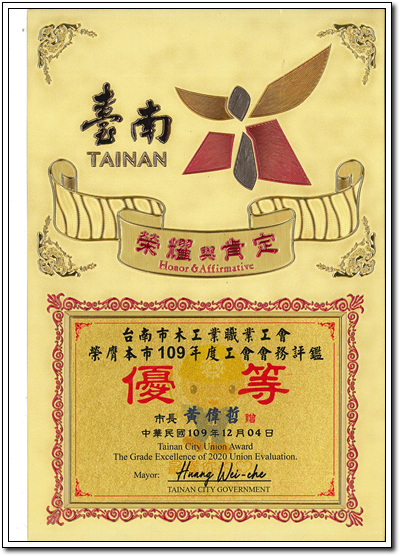本會榮膺臺南市109年度工會會務評鑑-優等獎