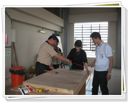 | 楊老師於試題前對主要尺寸檢討 | 楊老師對女學員指導機具使用及安全性 |