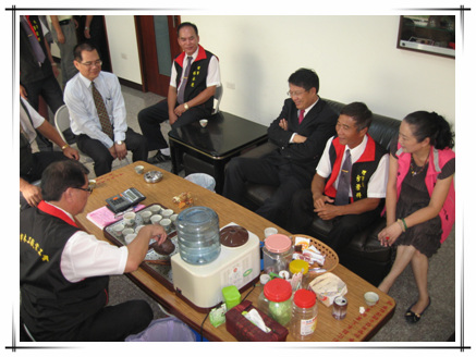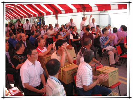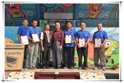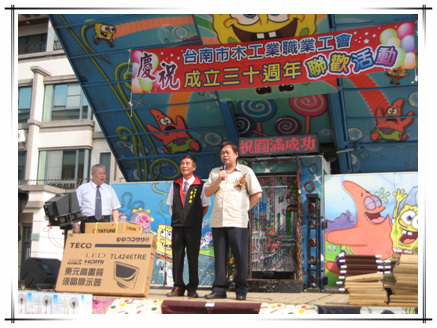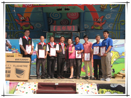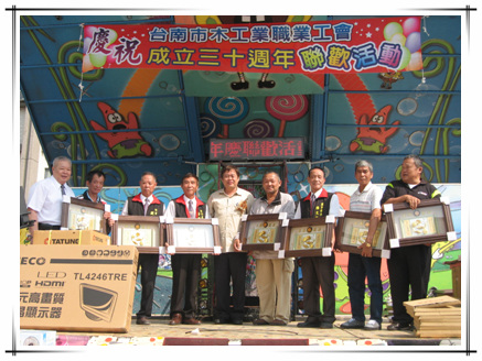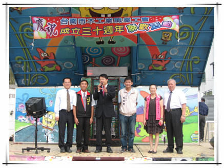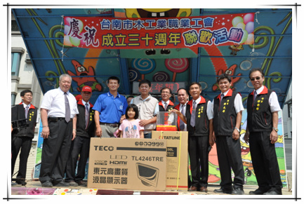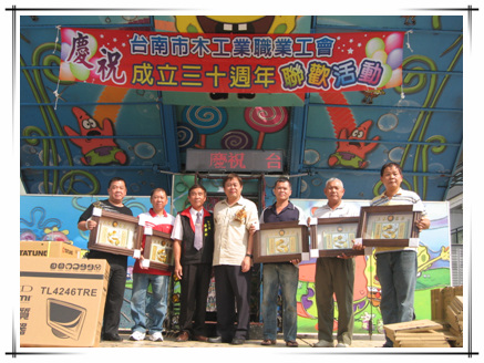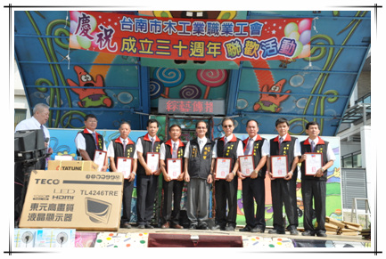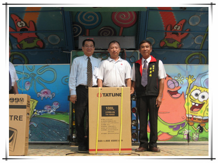 | 由台南市勞工黨部蔡副忠生主委頒發愛心志工獎狀 | 由勞工局王鑫基局長抽出第一特獎冰箱並合影 |