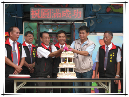 | 由林炳利市議員抽出特獎-電視並合影 | 林炳利市議員與方常務及全體理監事合切蛋糕歡唱 |
