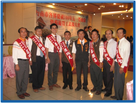 模範勞工李省興與顏副市長.王局長及林理事長合影 |