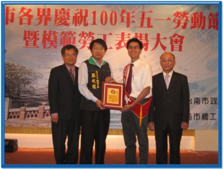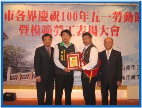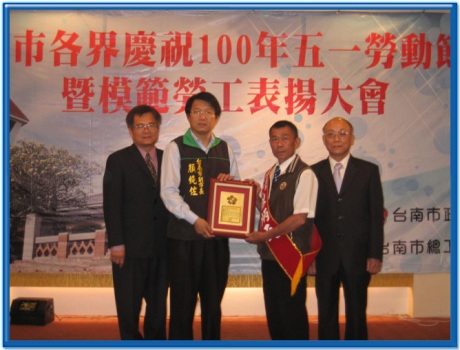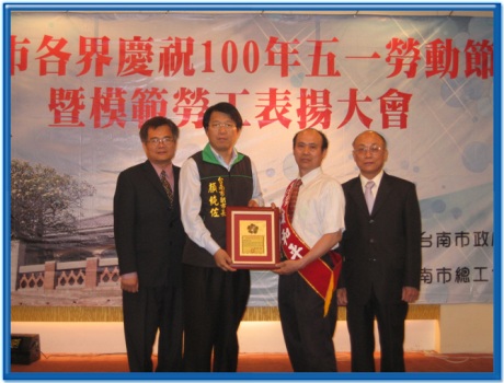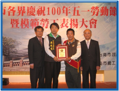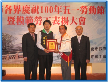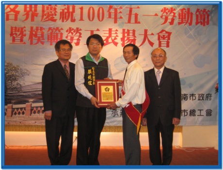 模範勞工吳炎全與顏副市長.王局長及林理事長合影 |