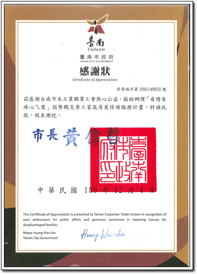 本會配合臺南市政府勞工局 辦理”有情有疼心ㄟ厝_弱勢家庭房屋修繕服務計畫” 獲得臺南市政府109年度頒發感謝狀