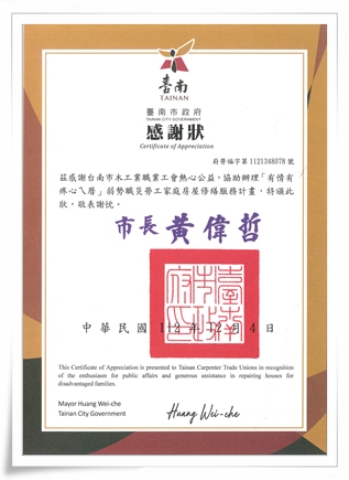 本會配合臺南市政府勞工局 辦理”有情有疼心ㄟ厝_弱勢家庭房屋修繕服務計畫” 獲得臺南市政府112年度頒發感謝狀