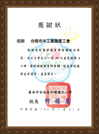 | 愛心修繕和順國小頒發感謝狀 | |